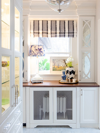 The pantry received a small but impactful refresh that brought new energy to the space. We added antique mirrored glass subway tile for a touch of vintage charm, layered in graphic artwork for personality, and updated the lighting with pleated coral sconce shades that feel both playful and refined. A few well-chosen accessories completed the look, making the pantry feel as thoughtfully designed as the rest of the home.