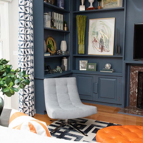 This space went from rec room to beautiful and functional home office. New furniture, window treatments, a rug, and decor transformed this space. Plus, a fresh coat of blue hue paint splashed on the built-ins modernizes this space!