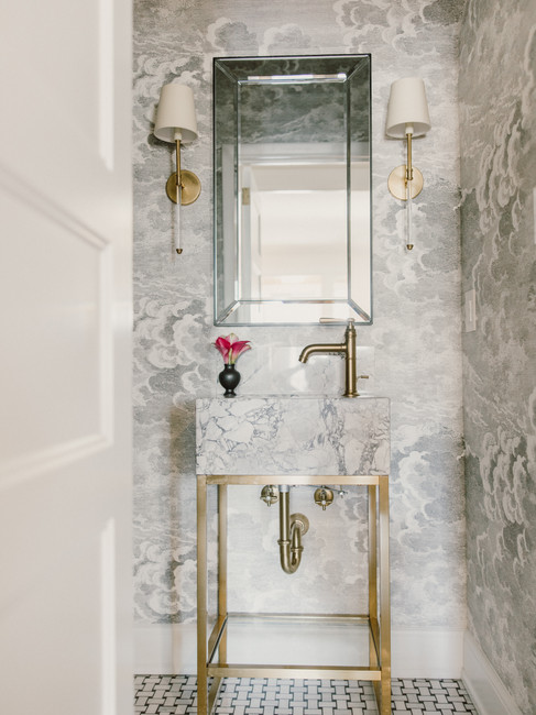This powder bath is from our #BrilliantlyBespoke project! Where to start with this transformation. We completely changed the design by switching out the flooring for a basketweave tile, new vanity, mirror, lighting, and we added wallpaper. This cloud wallpaper is one of our favorites from Schumacher!