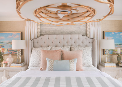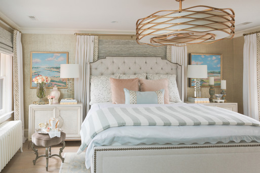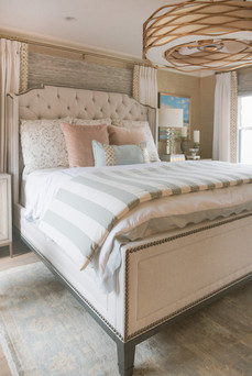 Blush is one of my favorite colors of the home! It's truly neutral in my book! Let's talk about the bed and bedding first. Layers are the best way to make your bed look like the epic beds you see in the showrooms. I usually opt for three euros, two 22x22 pillows, and a 14x20 lumbar or bolster-style pillow in the very front. I pulled the greyish tones, blue, and baby blue to tie it all together. Antique brass and grey studded jeweled tape on the lumbar match the tape on the draperies too. I LOVE adding a scaldino to the foot of the bed for an extra layer but it's also known to keep your feet warm in the night. What a charming touch, right?