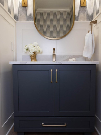 There’s not a space too small for great design, in fact, the tiniest rooms can be the most fun to create. The traditional elements of wainscoting, stately hardware and classic cabinetry pair so wonderfully with an eye-catching wallpaper, striking countertop and modern oval mirror. Mixing traditional with more of-the-moment elements is transitional to a T and we love that this powder room will stand the test of time.
