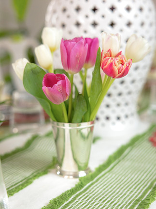 Large Clover Temple Jar | Les Touches Pillow in Navy | Anne Nickel Vase | Daphne Bowl | Embellished Glass Cake Plate | Lattice Cane Pitcher | Rattan Napkin Rings | Red Starburst Placemat | Rialto Colored Glass Tulip Glasses | Turquoise Acrylic Flatware Set | Pink Cherry Blossom Branch | Heirloom Pearl Edge Dinner Plates | Fluted Drinking Glass