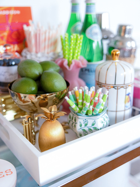 Let's cheers to love. And to do that, why not set up an adorable drink station? We styled this chic bar cart with pretty paper straws, tiny umbrellas, vibrant cocktail napkins and sweet accessories (along with the components of delicious cocktails and mocktails of course).