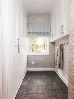 Larger mudrooms provide optimal opportunities for making it multi-purpose. For the mudroom on the left, we fit a hallway of cabinets for coats, a drop all zone with storage for dog leashes, a dog room, and powder bath. The flooring is durable and darker so it doesn't show dirt when trekking in through all seasons.