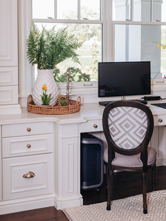 This client absolutely adores accessories and table settings- some are new and most are the special antiques she's collected over the years. We redesigned her pantry into a chic office with a pantry and table setting storage. She has an acrylic counter stool with a pink vinyl seat at counter height for her. The french tufted seat cushion is a beautiful detail that centers the space and allows for a comfy spot to rest and read a book!